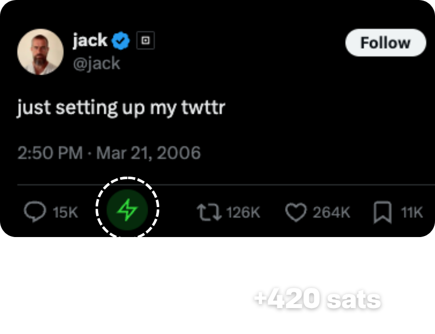 Log in with X. Get Tipped in Bitcoin. Start earning sats for your posts, replies, and retweets, instantly. Powered by Spark and Lightning.